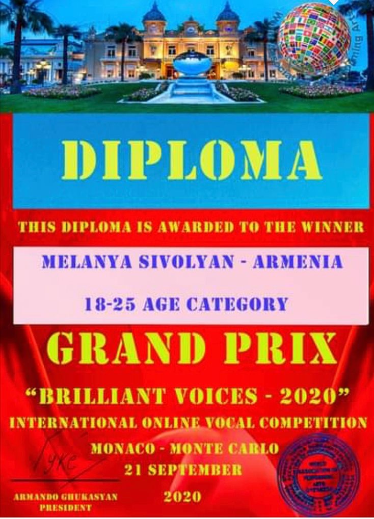 Mila Sivolyan has had a big success by winning an important online music festival based from Monaco. She won the diploma top prize for the 18-25 years category for the Brilliant Voices 2020 competition.