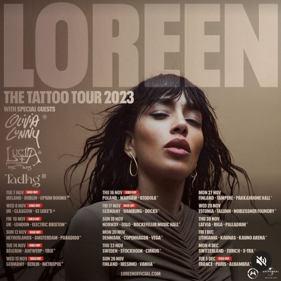 Loreen will begin her Tattoo Tour on 7 November in Dublin, Ireland. Then she will continue around Europe with an extensive trek taking in many countries.