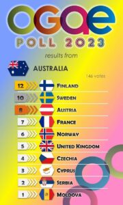 2023 Eurovision Song Contest OGAE 2023 VOTING POLL RESULTS FROM AUSTRALIA 24 April 2023 Roy van der Merwe Leave a comment OGAE AUSTRALIA has voted. Their top 3 are Finland, Sweden and Austria.