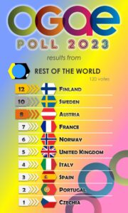 OGAE REST OF THE WORLD has voted as well. Not sure what the totals are for the members in various countries.