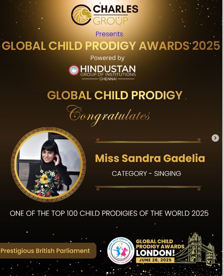 Sandra Gadelia has won the prestigious Global Child Prodigy Awards 2025 nomination in the Top 100 Child Prodigies globally for the second time for her talent and achievements in the category of Music & Singing.