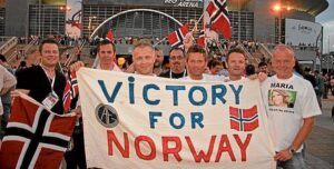 You can watch and listen to the song below and also take a look at a photo from OGAE Norway – they made a banner VICTORY FOR NORWAY and ESC Covers first set eyes on this banner in Dublin in 1995 and then Norway won. We tried to find a picture from that year but was not successful and got the one from 2008 in Belgrade. This banner travels every year with OGAE Norway to the host country.