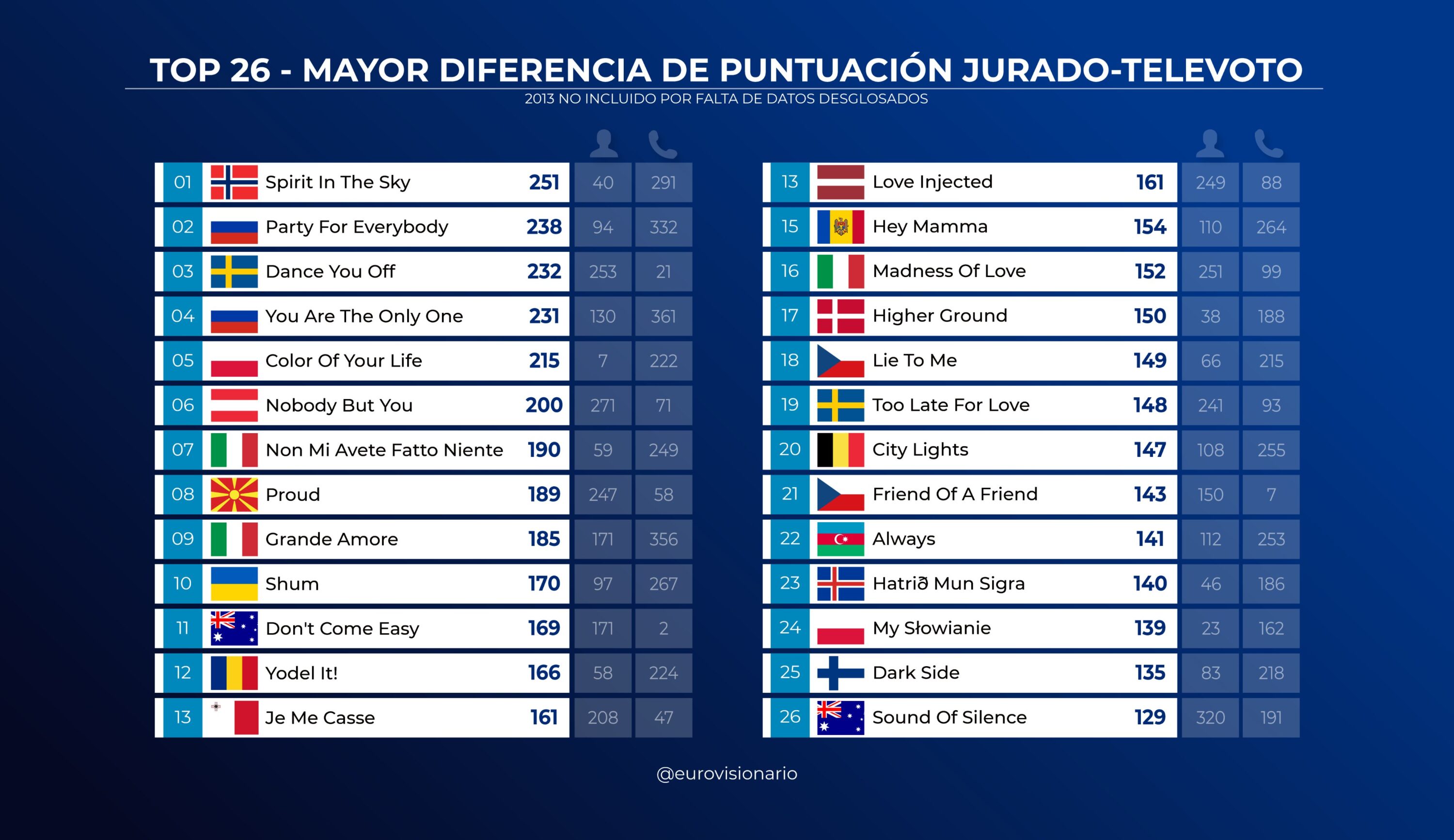 ESC Covers saw a wonderful display listing the top 26 Eurovision entries with the biggest difference between the jury and public voting done by a Spanish Eurovision site.